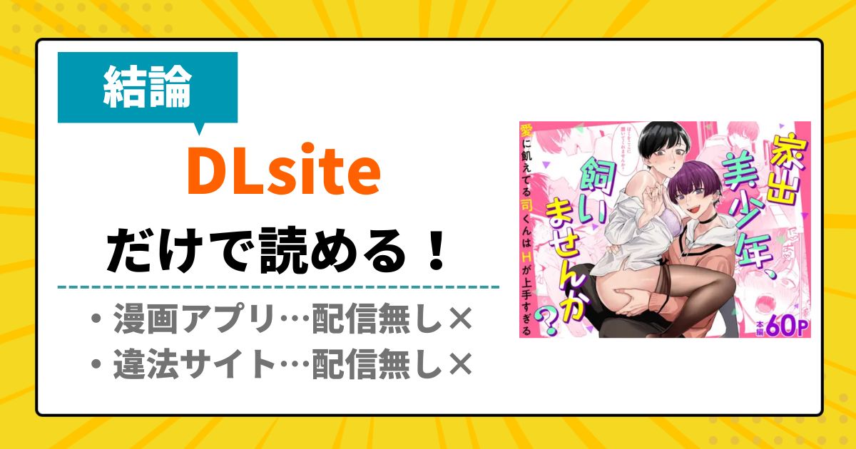 調査の結果、漫画「家出美少年、飼いませんか? 愛に飢えてる司くんはHが上手すぎる」はDLsiteでしか読めないと判明しました。